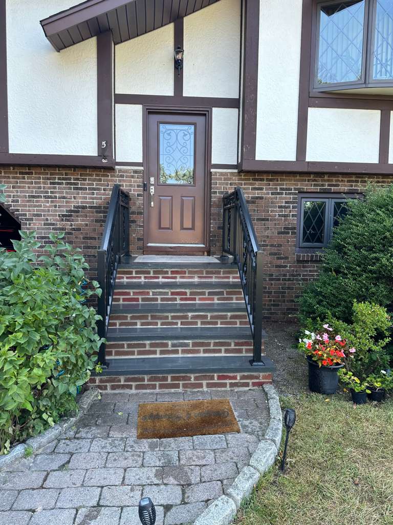 The existing steps were replaced with new brick and stone materials, complemented by decorative metal railings.